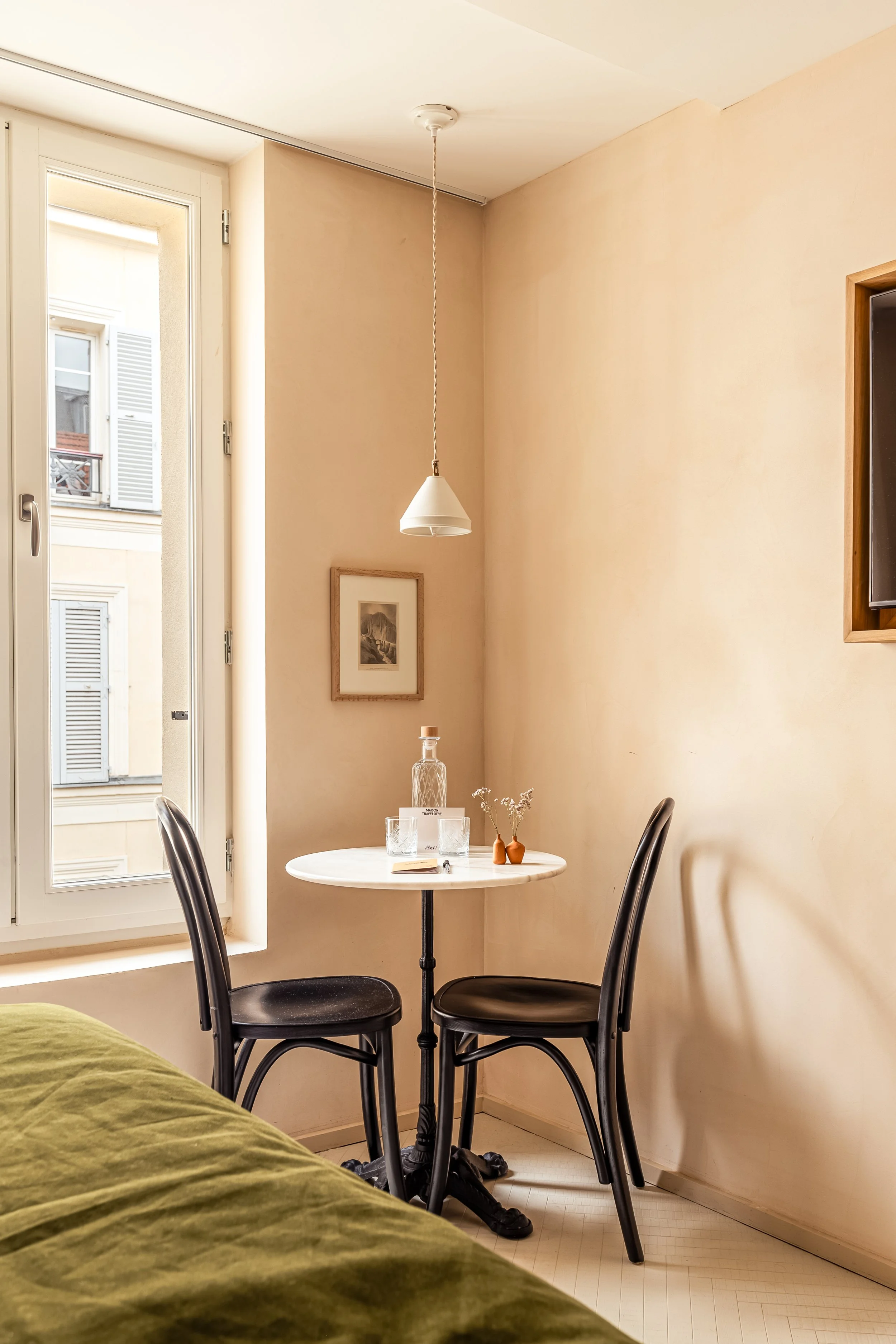 Parfaites pour 2 personnes pour de longs séjours, notre grande chambre Parisienne a été totalement repensée et rénovée dans le respect de l’histoire du bâtiment : enduit à la chaux, parquet ancien, tomettes, … pour vous accueillir dans le plus grand confort.