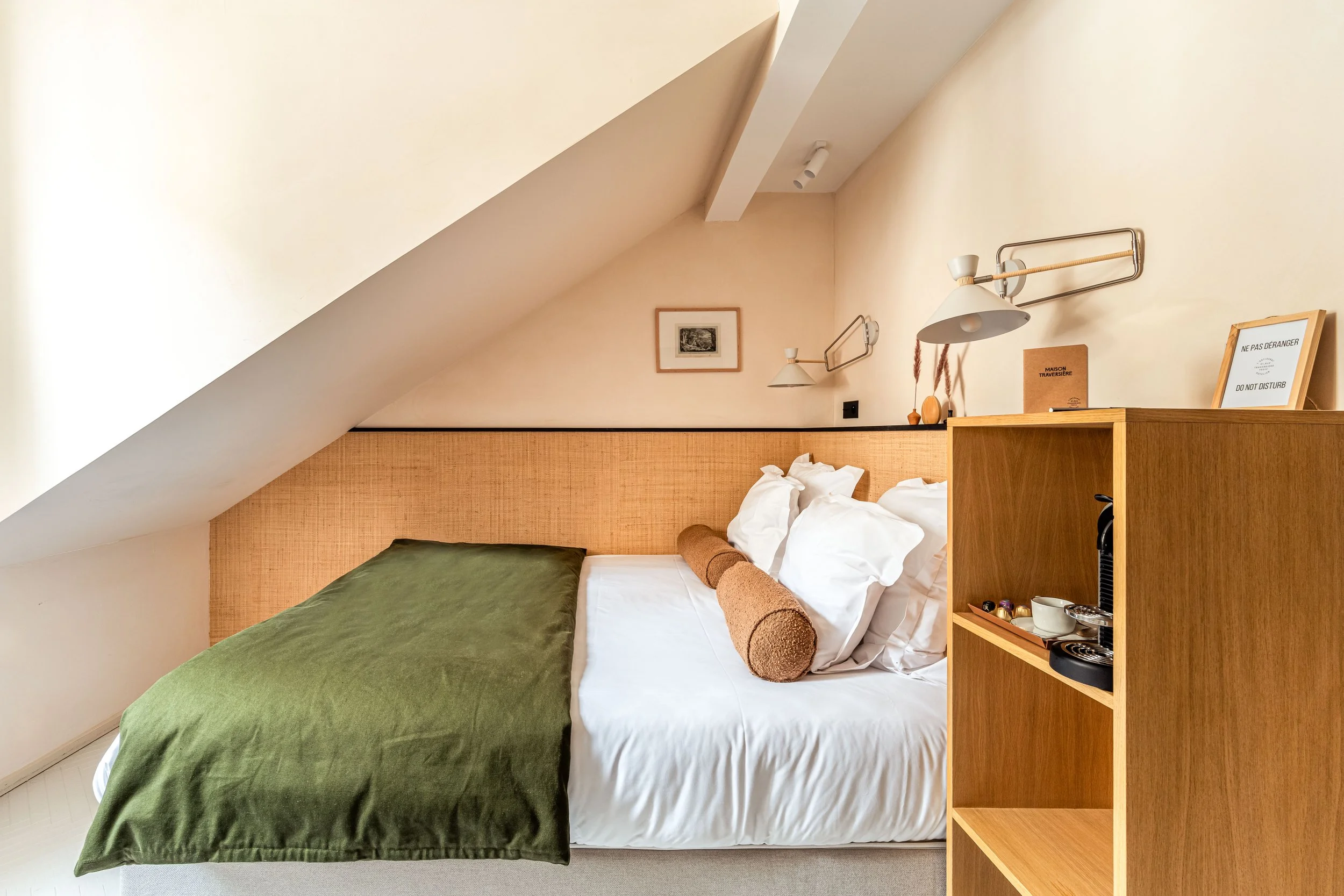 Parfaite pour 1 personne et pouvant accueillir 2 adultes, notre chambre Traversière a été totalement repensée et rénovée dans l'esprit d'un appartement parisien : parquet ancien, tomettes, moulures… pour vous accueillir dans le plus grand confort.
